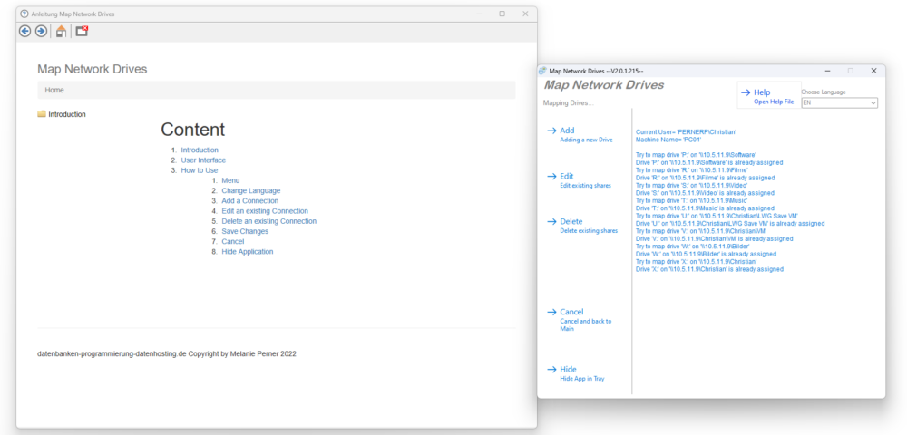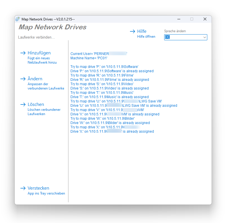 Die Anwendung ist in AutoIt geschrieben, die Konfigurationsdaten Ihrer Verbindungen und der von Ihnen benutzte Laufwerksbuchstabe werden lokal in einer Datei, im selben Verzeichnis wie die Anwendung, abgelegt. Falls Sie die Benutzerkontensteuerung (UAC) in Windows aktiviert haben, legen Sie die Anwendung bitte nicht auf dem Laufwerk, auf dem das Betriebssystem installiert ist ab, sondern verwenden Sie ein alternatives Laufwerk um ein starten mit erhöhten Rechten vermeiden zu können.